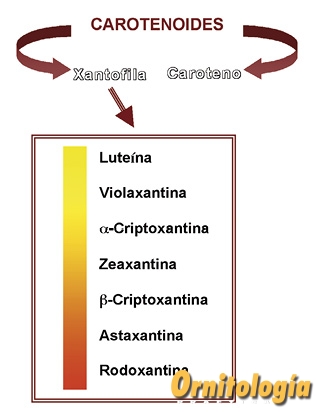 • En general, luteína y zeaxantina dan lugar a la síntesis de prácticamente la totalidad de pigmentos amarillos existentes en aves.