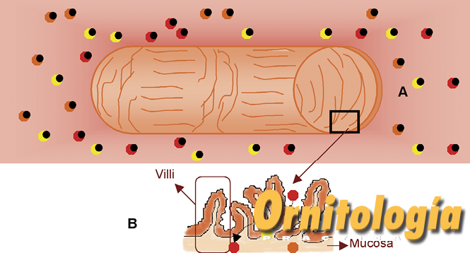 Cuando las aves ingieren las semillas, se desencadena toda una serie de reacciones químicas propias del proceso de digestión, lo que permite que finalmente los animales obtengan nutrientes de los alimentos tales como las vitaminas, sales minerales, proteínas, etc. Gracias a este proceso, las aves obtienen también los carotenoides presentes en la dieta. Dichos carotenoides pueden ser modificados o no por el animal, tal como se ha descrito. En cualquiera de los casos, los carotenoides deben ser absorbidos, en el intestino delgado, principalmente. Con objeto de facilitar dicha absorción, la mucosa del intestino posee una serie de proyecciones, como dedos de guante, llamadas villi o vellosidades. En el interior de cada villi existe una vénula, una arteriola y un vaso linfático, que recogerán los carotenoides absorbidos y los distribuirán a lo largo de todo el organismo, gracias al torrente sanguíneo (Fig. 3).