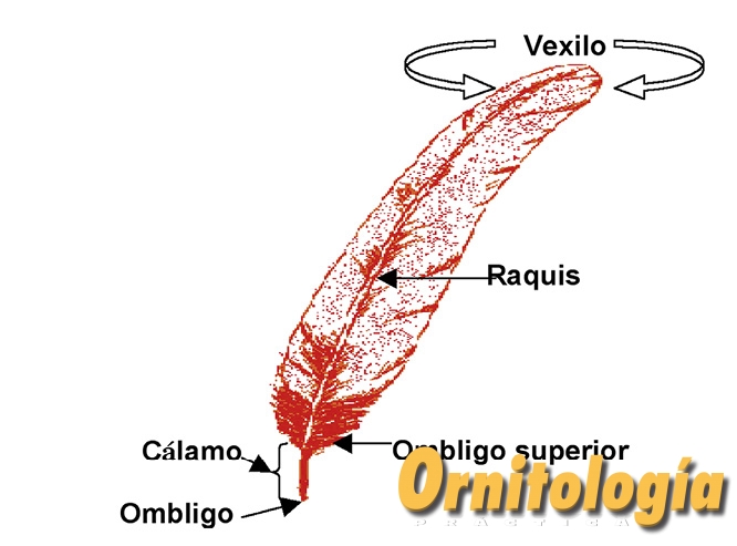 En una pluma típica, la parte central (raquis) sirve de eje y tiene el aspecto de una caña hueca; a pesar de ser una estructura muy ligera, confiere a la pluma la rigidez necesaria para mantenerla firme. La parte inferior del raquis, más ancha, hueca y generalmente desnuda, se denomina cálamo o cañón. Mediante el cálamo, la pluma se inserta en la piel. En la parte inferior del cálamo hay un orificio, denominado ombligo inferior, que es por donde la pluma se alimenta durante su crecimiento. El cañón es hueco, puesto que la pluma es una estructura muerta, como las uñas, y una vez que ha terminado de crecer, los vasos sanguíneos que la alimentaban se retiran y queda el haz vacío.